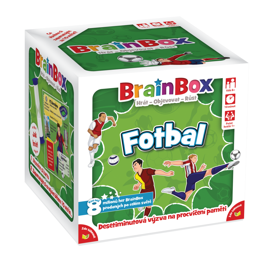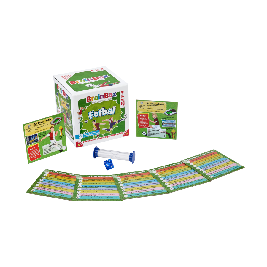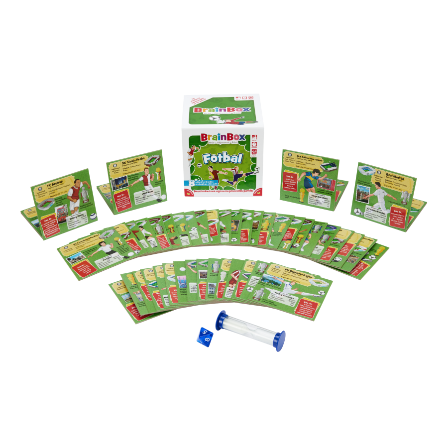 BrainBox je zábavná paměťová a postřehová karetní hra, která otestuje váš smysl pro detail. Odpovědi na všechny otázky máte přímo před sebou na kartě. Bude vám stačit 10 vteřin na to, abyste si všechno zapamatovali? Tato edice hry, věnovaná fotbalu, vás seznámí s těmi nejznámějšími fotbalovými týmy světa, jejich stadiony a klubovými legendami. Hra BrainBox Fotbal obsahuje 55 hracích karet s ručně malovanými Ilustracemi, včetně oblíbených českých klubů SK Slavia Praha a AC Sparta Praha. Hra pomáhá malým i velkým fanouškům fotbalu dozvědět se více o světových klubech, a přitom rozvíjí kognitivní dovednosti, jako je postřeh a vybavování si vzpomínek, které tvoří základ pro celoživotní vzdělávání. BrainBox je zábavná paměťová a postřehová karetní hra, která otestuje váš smysl pro detail. Odpovědi na všechny otázky máte přímo před sebou na kartě. Bude vám stačit 10 vteřin na to, abyste si všechno zapamatovali? Tato edice hry, věnovaná fotbalu, vás seznámí s těmi nejznámějšími fotbalovými týmy světa, jejich stadiony a klubovými legendami. Hra BrainBox Fotbal obsahuje 55 hracích karet s ručně malovanými Ilustracemi, včetně oblíbených českých klubů SK Slavia Praha a AC Sparta Praha. Hra pomáhá malým i velkým fanouškům fotbalu dozvědět se více o světových klubech, a přitom rozvíjí kognitivní dovednosti, jako je postřeh a vybavování si vzpomínek, které tvoří základ pro celoživotní vzdělávání.