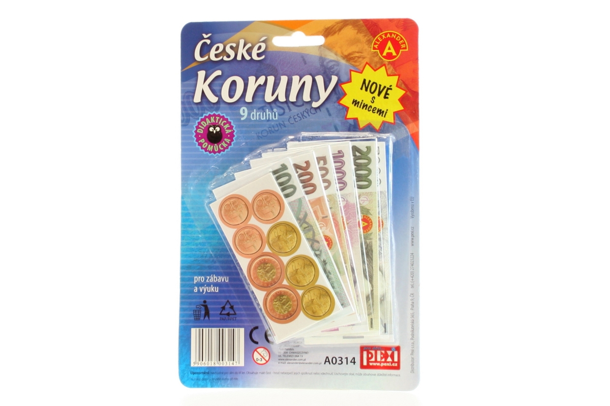 Peníze - české koruny, 9 druhů mincí a bankovek. Pro zábavu i výuku. Rozměr bankovek cca 11 x 5 cm.