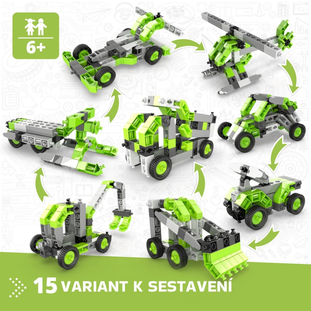 Stavebnice řady Engino Creative Builder podporují tvořivost a manuální zručnost dětí. Umožňují snadno a rychle přetvářet jeden model na druhý. Dle přiloženého návodu a mobilní aplikace krok po kroku snadno vytvoříte 15 různých modelů. Interaktivní aplikace Engino kidCAD® zobrazí modely ve 3D, které si můžete libovolně otáčet, prohlížet a upravovat. Kompatibilní s ostatními druhy stavebnic Engino. Vhodné od 6 let, vyrobeno na Kypru EU.