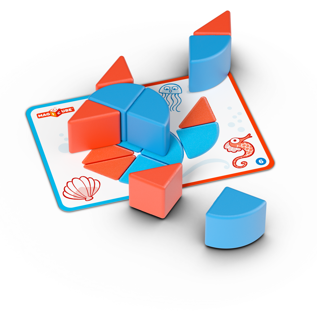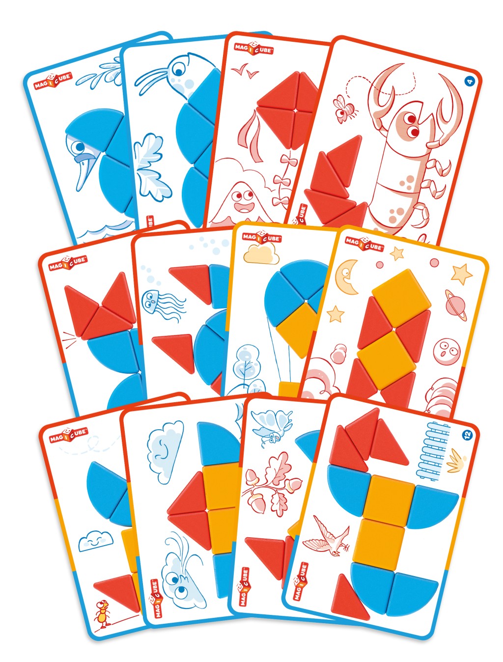 Unikátní magnetická stavebnice doplněná kartičkami pro snadné vytváření obrázků. Přechází od jednoduchých po složitěší varianty práce s různými tvary. Šablony odpovídají skutečné velikosti dílků 1:1. Atraktivní zábava pro menší děti – podporuje fantazii a tvořivost. Obsahuje 10 magnetických prvků a 6 oboustranných kartiček s 12 návody. Vyrobeno ze 100% recyklovaného plastu. Vhodné pro děti od 2 let.