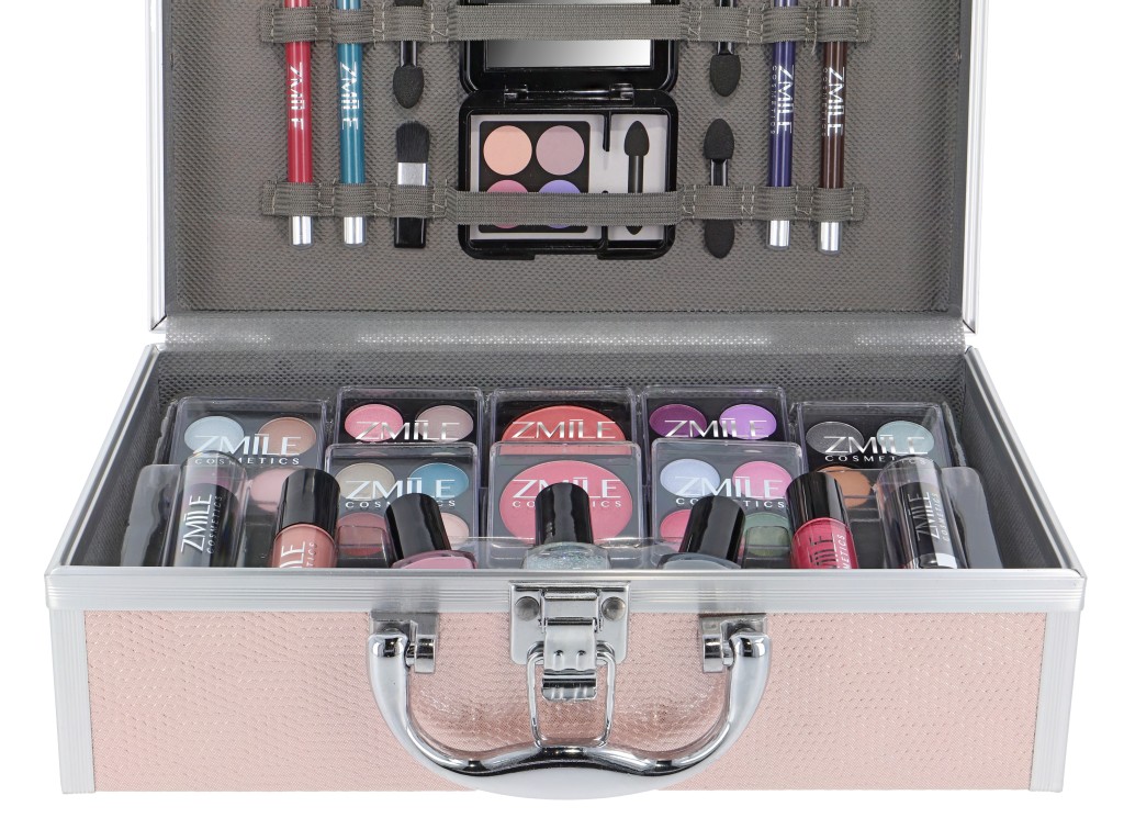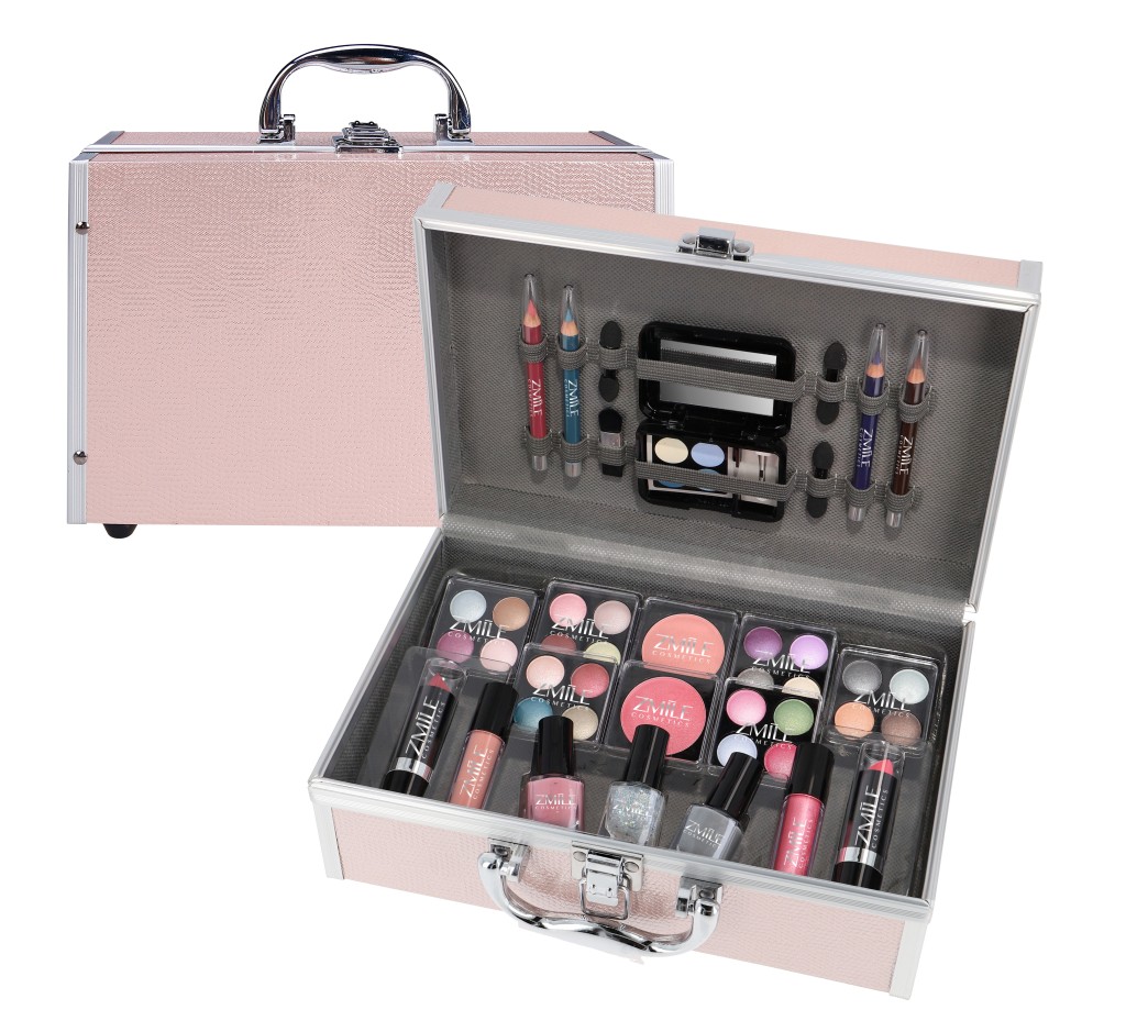 Kosmetický kufřík růžový "Eye-Catcher" s integrovaným zrcátkem – celkem 42 ks příslušenství. Obsahuje 24× očními stíny ,2xlak na nehty, 1xtř´pytkový lak na nehty,1× tvářenku, 2xrtěnku, 2xlesk na rty, 3× tužku na oči, 1xtužku na oči, 3× oboustranný aplikátor, 1xštětec. Dermatologicky testováno, vyhovuje přísným normám EU.