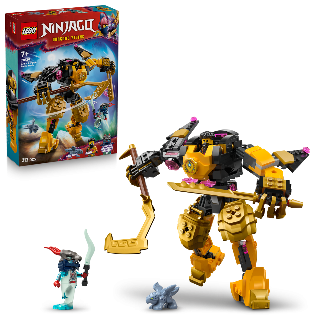 Milovníci nindžů od 7 let si se stavebnicí LEGO® NINJAGO (71839) Arin a bojový robot Spinjitzu můžou přehrát scény ze 3. řady seriálu NINJAGO® Dračí povstání. Tato stavebnice pro děti obsahuje robota NINJAGO s pohyblivými pažemi a nohama, které lze naklánět a otáčet do různých poloh, otočný trup, otevírací hruď, do které lze umístit minifigurku, a 2 velké meče. Děti si také můžou postavit robota podle vlastní představivosti výměnou částí těla z Arinova bojového robota Spinjitzu za díly z přizpůsobitelných robotů z řady NINJAGO 2024 (prodávají se samostatně): Coleův živelný zemský robot (71806), Sorin živelný technický robot (71807), Kaiův živelný ohnivý robot (71808) a Lloydův robot živelné síly (71817). Tato nindžovská stavebnice obsahuje 2 minifigurky: Arina s křišťálovou katanou a Přízračného dračího bojovníka s vlastním mečem, se kterým si děti můžou přehrávat napínavé bitvy dobra proti zlu. Součástí je také model Riyu jako mláděte. Stavebnice obsahuje 213 dílků.