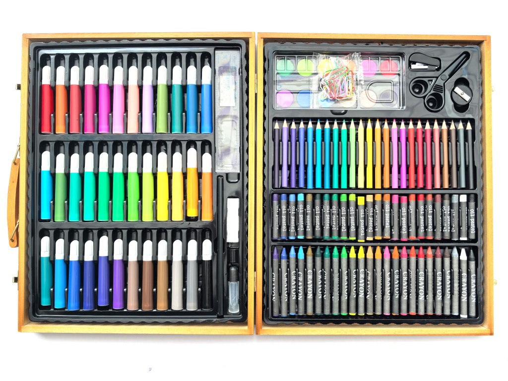 Vše, co malý i velký umělec potřebuje v jedné praktické sadě! Tento bohatě vybavený dřevěný kreativní kufřík obsahuje široký výběr výtvarných potřeb pro malování, kreslení, stříhání i lepení.