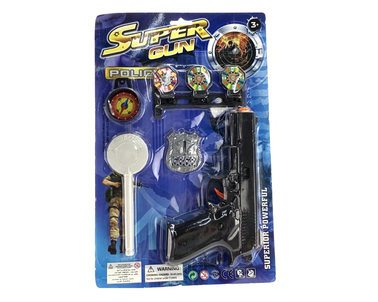 Sada pro malé policisty. Součástí sady je pistole, odznak, plácačka, terčíky a buzola.