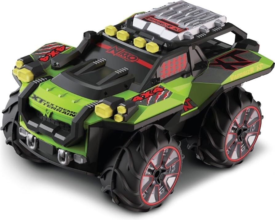 Připrav se na akční jízdu v jakémkoli terénu s Nikko VaporizR XT! Toto dálkově ovládané auto zvládne jízdu po souši, v blátě, po sněhu a dokonce i po vodě – díky čtyřkolovému pohonu a obojživelné konstrukci. S rychlostí až 15 km/h a precizním ovládáním je ideální pro všechny malé i velké dobrodruhy. 4×4 pohon pro jízdu v terénu i na vodě. Obojživelný design – jezdí po zemi i plave.Dálkové ovládání 2,4 GHz – až 10 aut najednou bez rušení. Rychlost až 15 km/h. Plně nabíjecí – baterie a nabíječka jsou součástí balení.