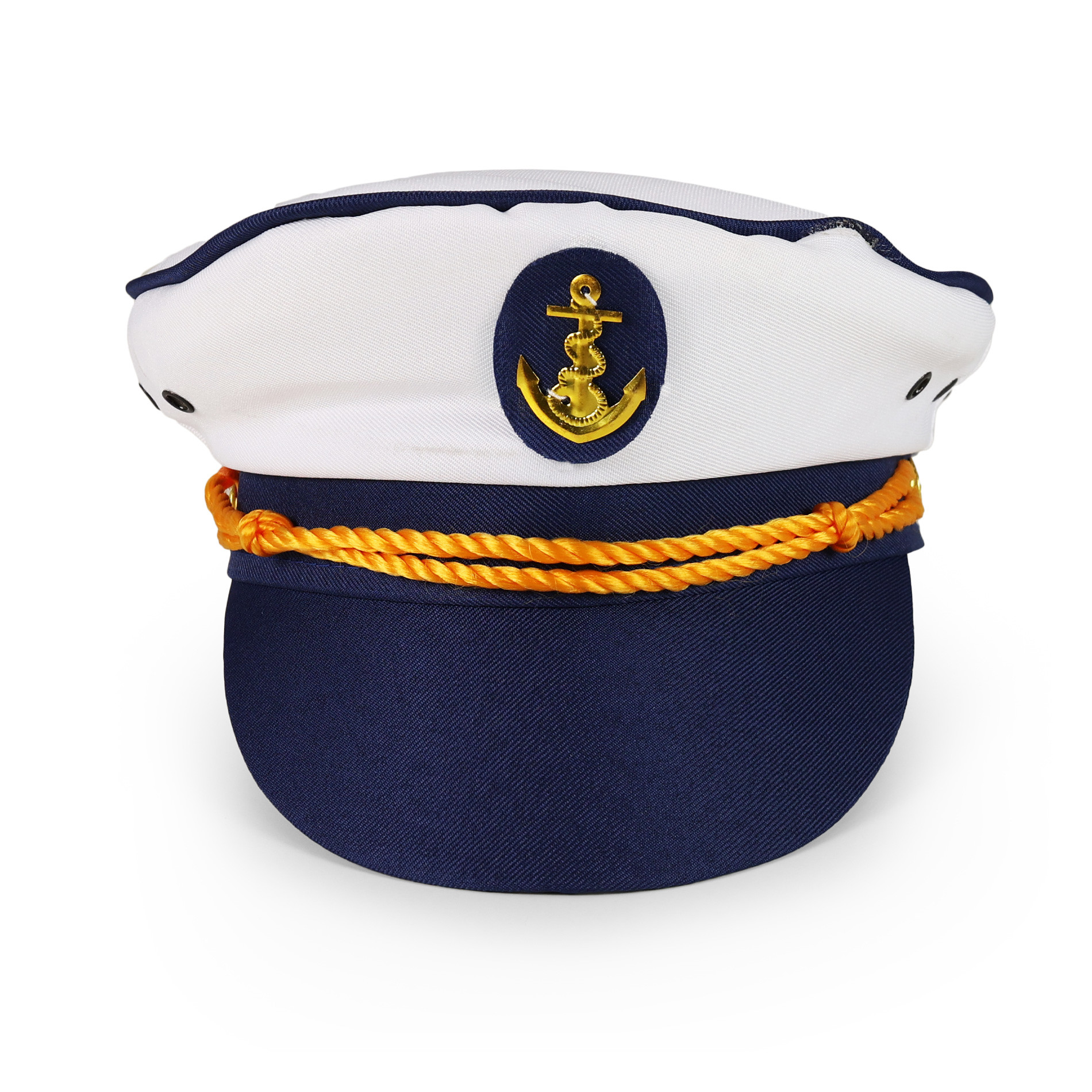 Stylová námořnická čepice pro malé námořníky! Bílá námořní čepice s modrým kšiltem a lemováním je vpředu dekorována zlatou podkovou. Díky této nepřehlédnutelné čepici budeš hvězdou karnevalu a určitě ohromíš všechny své kamarády!