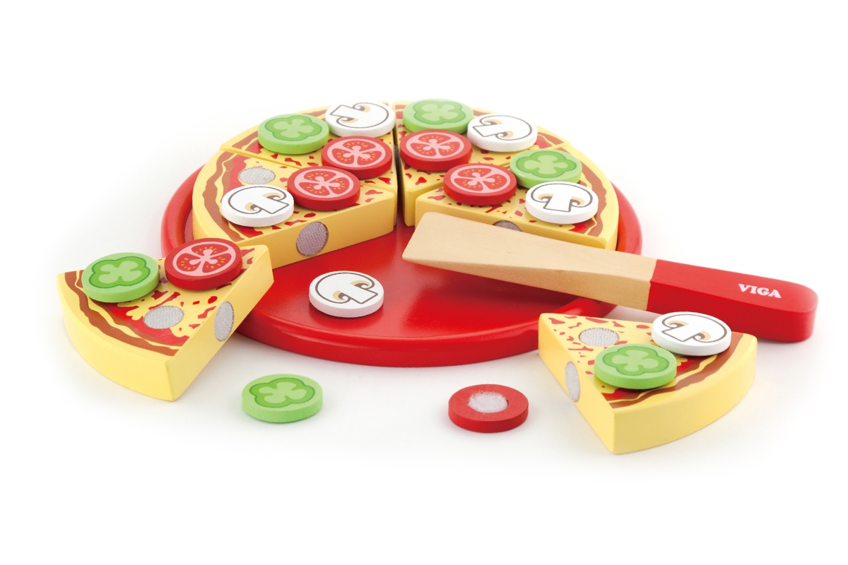 Dřevěná pizza - krájení. Balení obsahuje pizzu, tác a špachtli. Rozměry pizzy cca 23 x 3,5 cm. Rozměry balení cca 28 x 28 x 5,5 cm. Věk 18m+