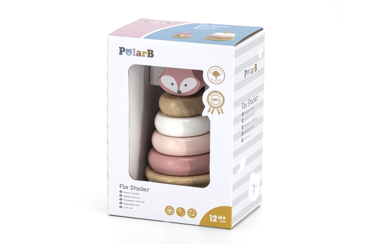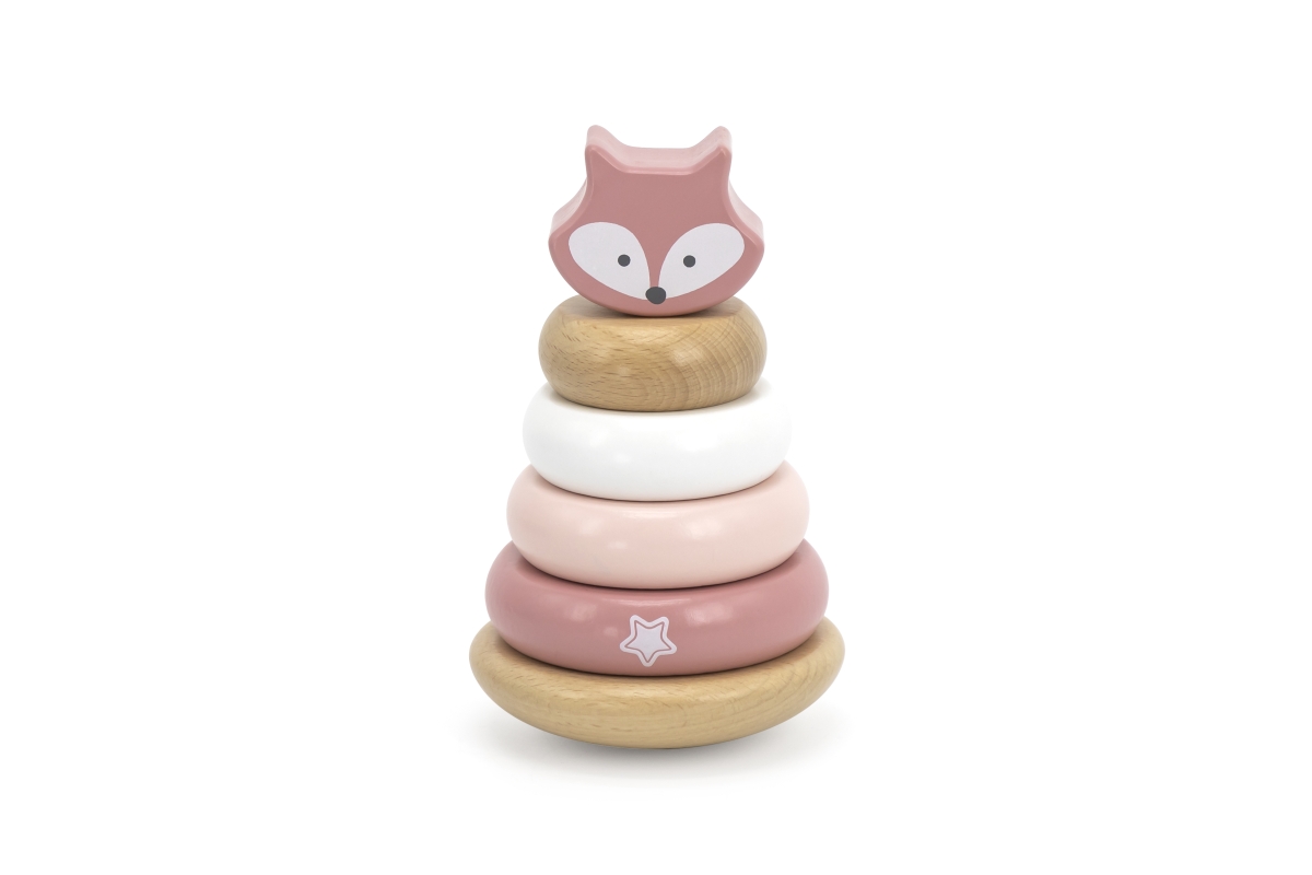 Dřevěná skládací pyramida liška o rozměru cca 12 x 7,5 cm. Rozměry balení cca 13 x 18 x 9 cm. Věk 12 měs +