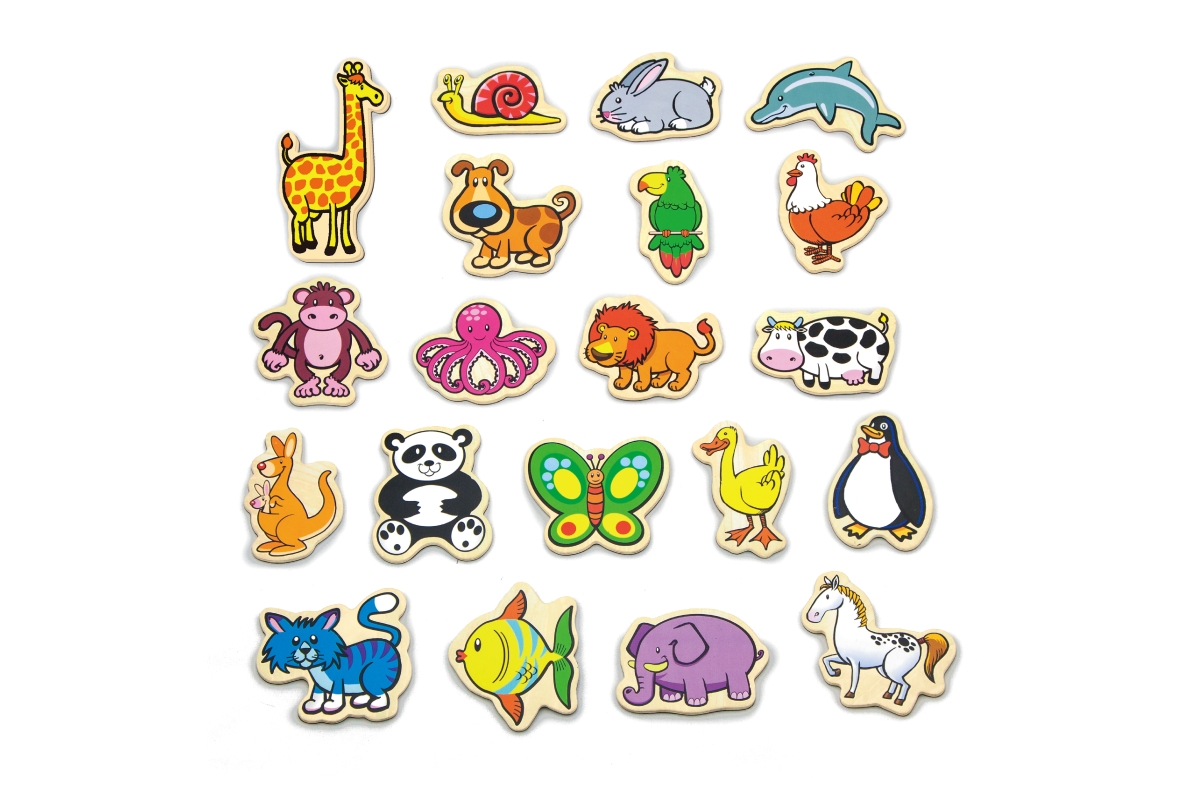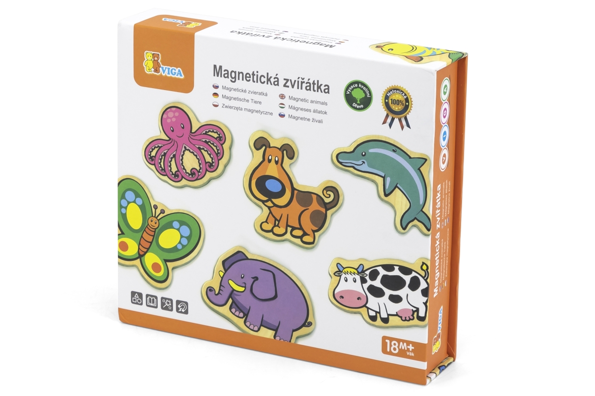 Dřevěné magnety se zvířátky. Baleno v české krabičce. Rozměry balení cca 21 x 19 x 4,5 cm. Věk 18m+. Rozměry v cm: Chobotnice – 8 x 6,5,Panda – 7 x 8,Pejsek – 8,5 x 8,Kravička – 8,5 x 5,Slepice – 6,5 x 8,5,Lev – 8,5 x 6,5,Slon – 8,5 x 6,Zajíc – 8,5 x 6,Papoušek – 4,5 x 8,Ryba – 7 x 8,Šnek – 8,5 x 4,5,Delfín – 9,5 x 5,Klokan – 5,5 x 8,Kůň – 8 x 8,Kočka – 8 x 7,5,Žirafa – 7 x 13,Opice – 8 x 8,5,Tučňák – 5,5 x 8,Motýl – 8 x 7,Kachna – 5,5 x 8,5