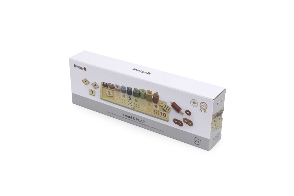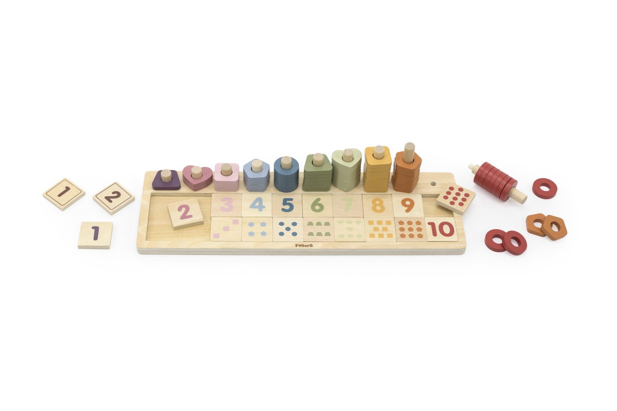 Dřevěná hra určená k trénování počítání do deseti. Hra obsahuje desku, stojánky určené k navlékání určitého počtu různých tvarů, kostičky s čislicemi a kostičky s obrázkama. Rozměry hry 36,5x11,4x8,5 cm. Rozměry balení cca 37x13x6 cm. Věk 3+