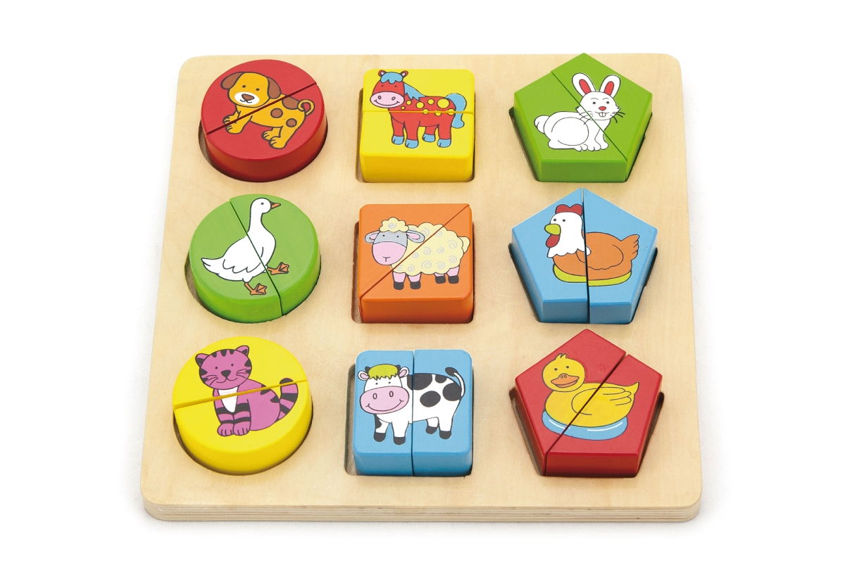 Dřevěné puzzle pro nejmenší v české krabičce. Obsahuje 18 dílků, ze kterých lze složit 9 obrázků.