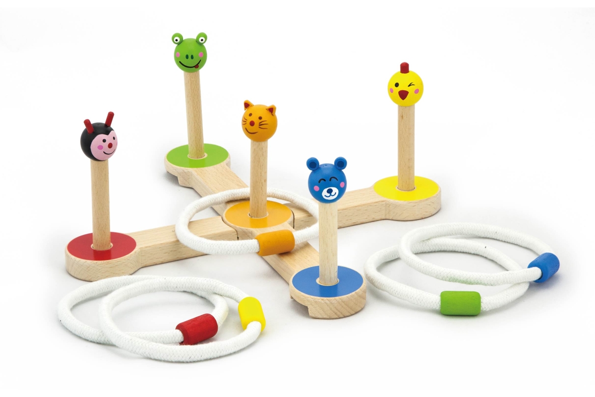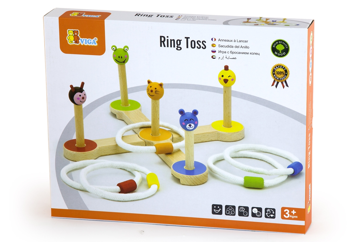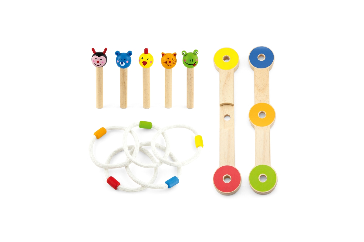 Dřevěná hra házení kroužků. Rozměry cca 28 x 2 x 10,5 cm. Rozměry balení cca 32,5 x 26 x 5 cm. Věk 3+